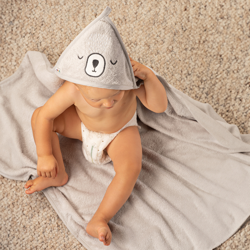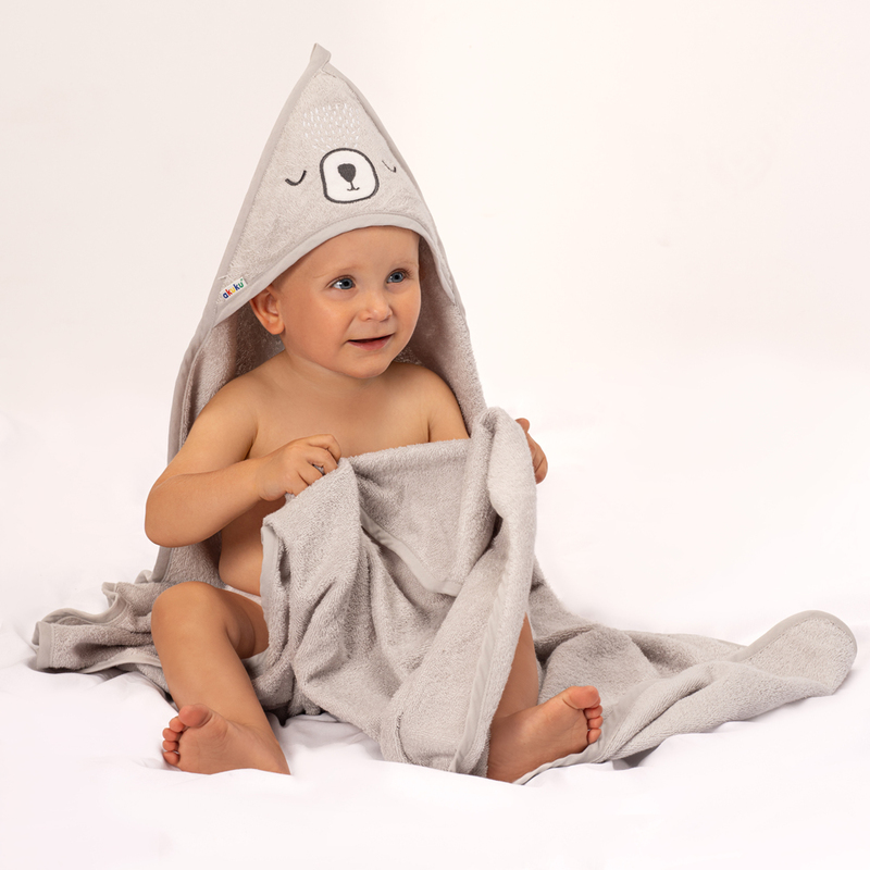 Izrađen je od visokokvalitetnog mekog pamuka i savršeno upija vlagu te uspješno štiti bebu od hladnoće. Vrlo je nježan, pa ne iritira kožu. Široki kroj ne ograničava djetetove pokrete. Ušivena kapuljača štiti mokru glavu .