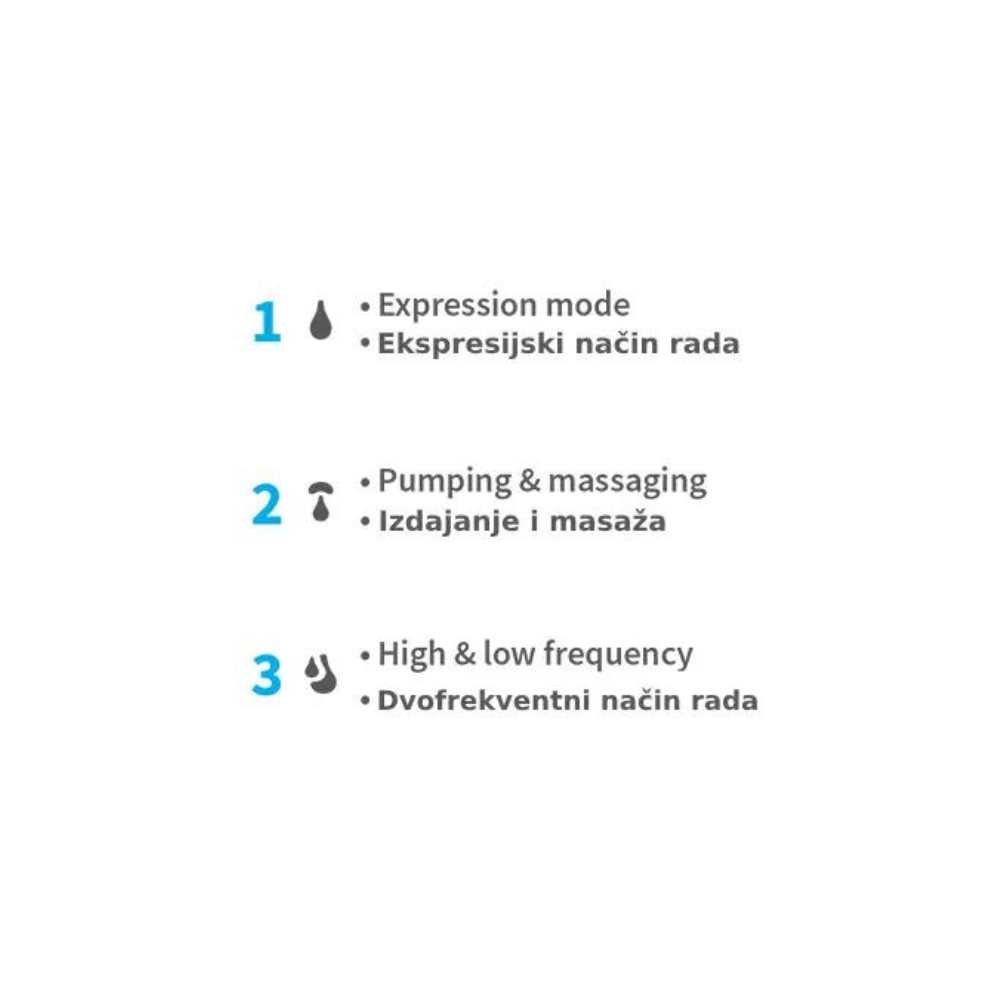 2. 2-u-1 način rada, odnosno izdajanje i masaža - ciklus se sastoji od 8 pokreta masaže, nakon kojih slijedi 1 pokret usisavanja. Ovaj način rada preporučuje se za ublažavanje bolova u punim dojkama i poticanje na izdajanje više mlijeka u kratkom vremenu.