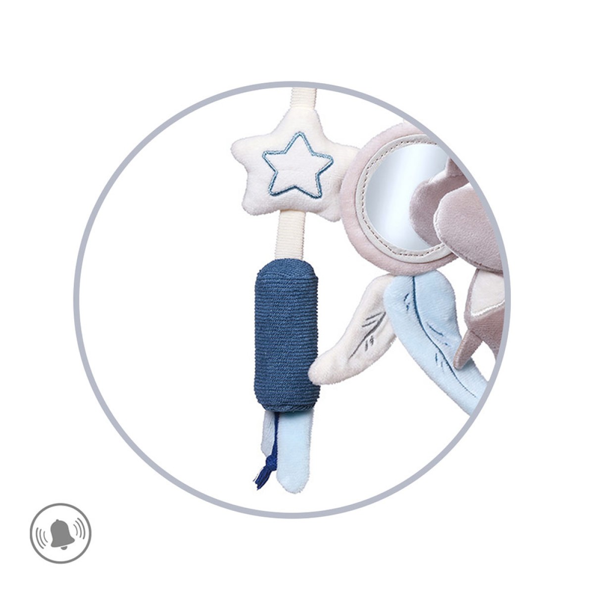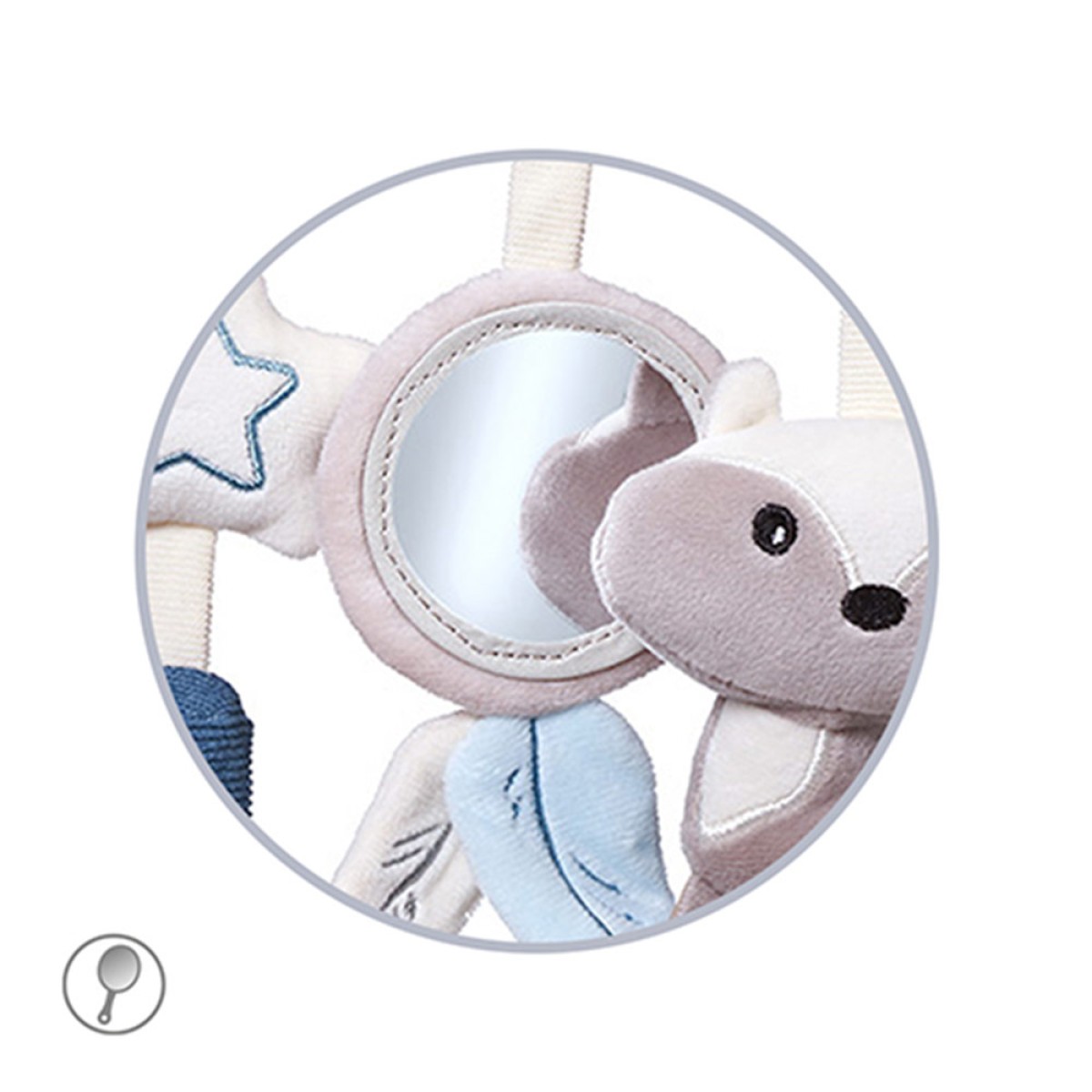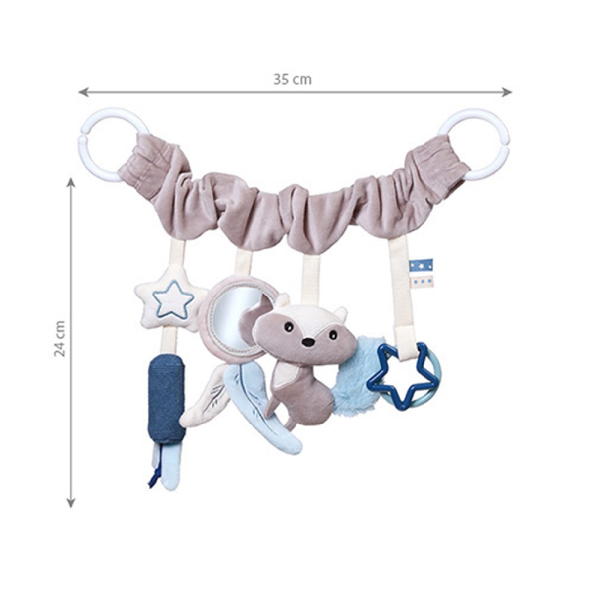Babyono viseća igračka u obliku rakuna obogatit će svijet vašeg djeteta i pomoći u razvoju koordinacije ruku i očiju te motorike. Ovaj privjesak možete pričvrstiti na kolica, kolijevku ili autosjedalicu, a on će zabavljati vašeg mališana tijekom šetnji ili putovanja. Na igrački koja je prekrivena materijalom ugodnim na dodir nalazi se šarmantni rakun s šuškavim repom i zvečka koja proizvodi zvuk zvončića. Tu se nalazi i ogledalo, krug i zvijezda. Zanimljivo odabrani elementi ugodni su na dodir i privlače pozornost malih ruku različitim uzorcima. Omogućuju vašem mališanu da otkriva svijet i razvija motoričke vještine kroz igru.