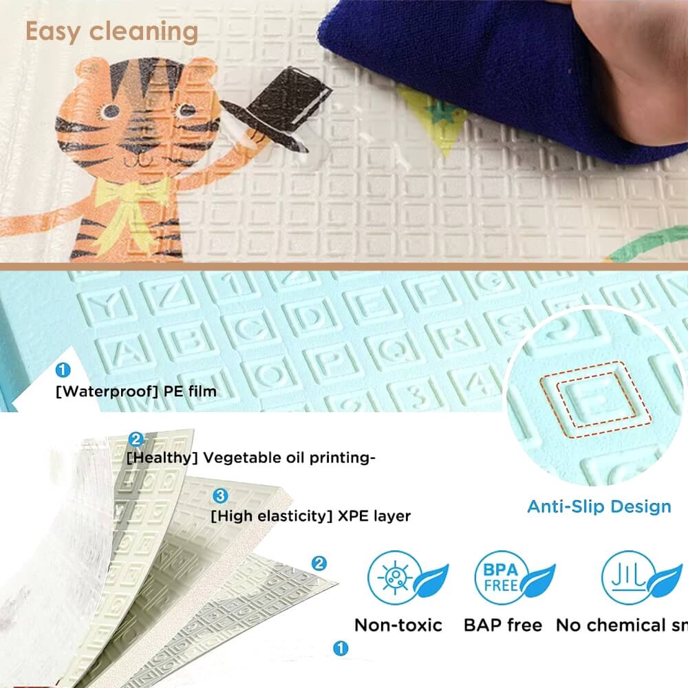-Svaka strana prostirke ima drugačiji dizajn sa slatkim uzorcima i atraktivnim bojama koje će vaše dijete voljeti.