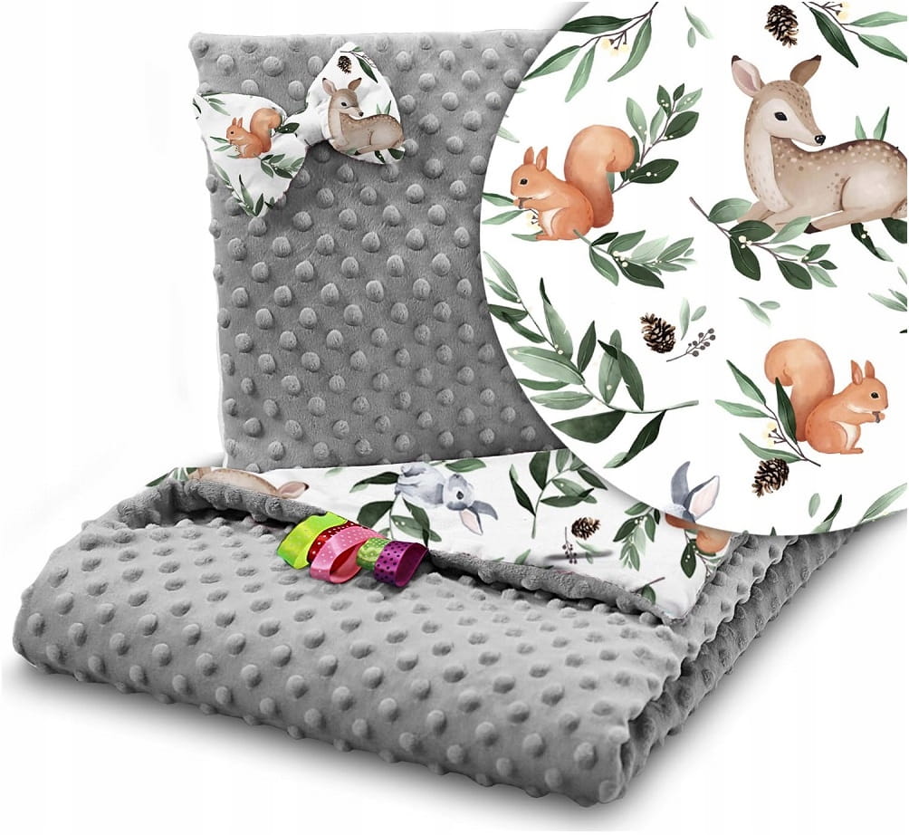 I jastuk i dekica su dvostrane - s jedne strane mekani minky materijal, s druge strane pamuk u raznim dezenima.