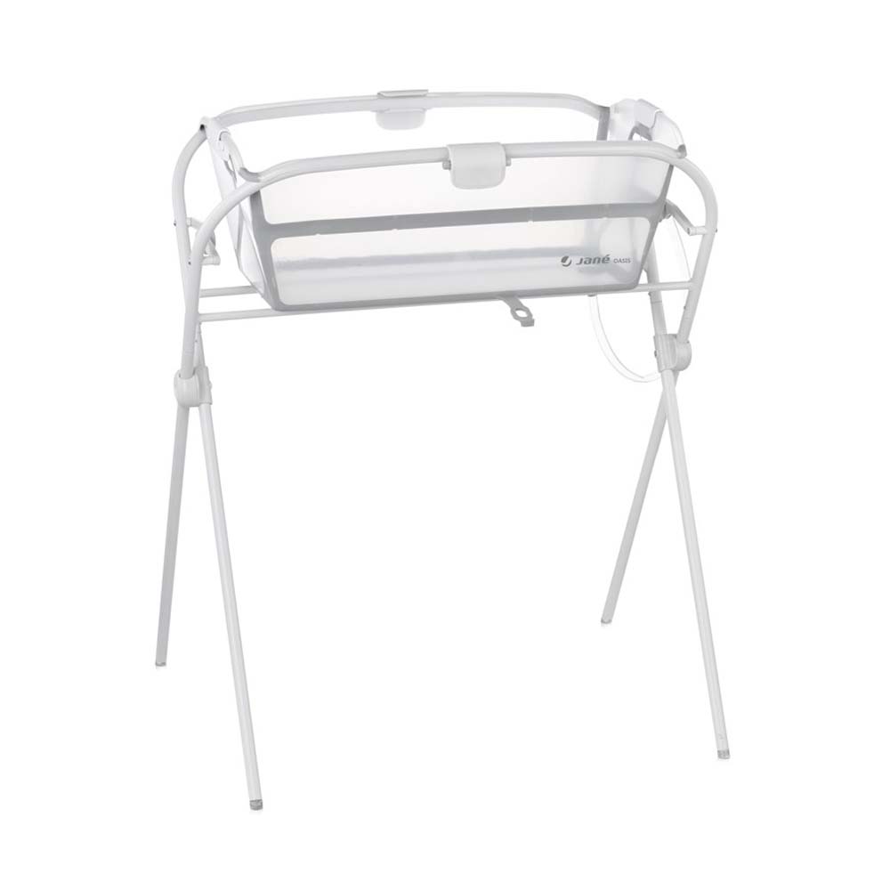 Jané Oasis stalak za sklopivu kadicu omogućuje vam da prijenosu kadicu podignete i time znatno olakšate kupanje djeteta. Rasklapanje i sklapanje ovog stalka jedanko je jednostavno i kompaktno kao i sklapanje pripadajuće kadice. Za dodatnu sigurnost na obje strane stalka nalaze se sigurnosni mehanizmi koji sprječavaju slučajno sklapanje stalka. Uz stalak dolazi i čep za odvod vode, prozirna cijev i držač pomoću kojeg se sustav odvoda vode pričvršćuje za Oasis kadicu. Oasis kadica se kupuje odvojeno.