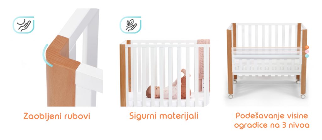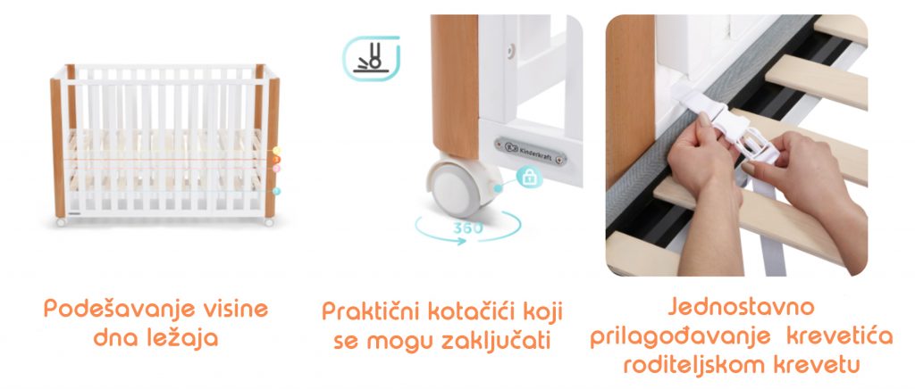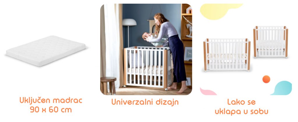 Također možete pretvoriti KOYA u mali krevetić za dojenčad veličine 90 x 60 cm. U prvih nekoliko mjeseci vaše dijete može biti zahtjevnije. Bit će vam mnogo lakše doći do svoje bebe koja će spavati u vašoj spavaćoj sobi. Zahvaljujući funkciji malog krevetića, KOYA neće zauzeti previše prostora u vašoj sobi. U setu možete pronaći madrac iste veličine, prilagođen potrebama malih beba, koji će vam poslužiti i kao mali krevetić i kao krevetić za spavanje. Mali krevetić ima podešavanje visine prečki na 4 razine, dok se madrac u krevetiću za spavanje može podesiti u čak 3 razine.