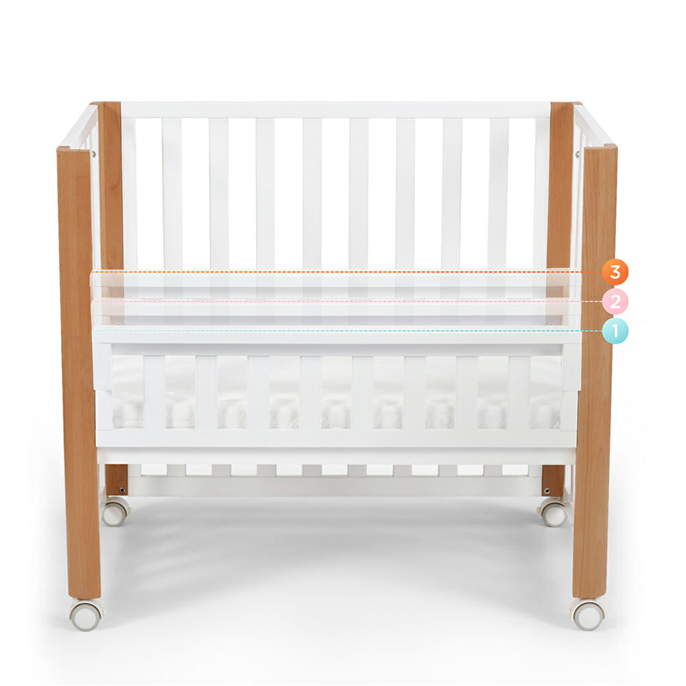 Krevetić 4u1 KOYA može se koristiti kao krevetić za zajedničko spavanje – samo uklonite jednu stranu i instalirajte podnice na predviđeno mjesto, a zatim pričvrstite krevetić za spavanje remenima. I spreman je! Vaša beba će se osjećati sigurnije što ste pored njih i nećete morati ustati i ići preko sobe kako biste nahranili svog mališana.
