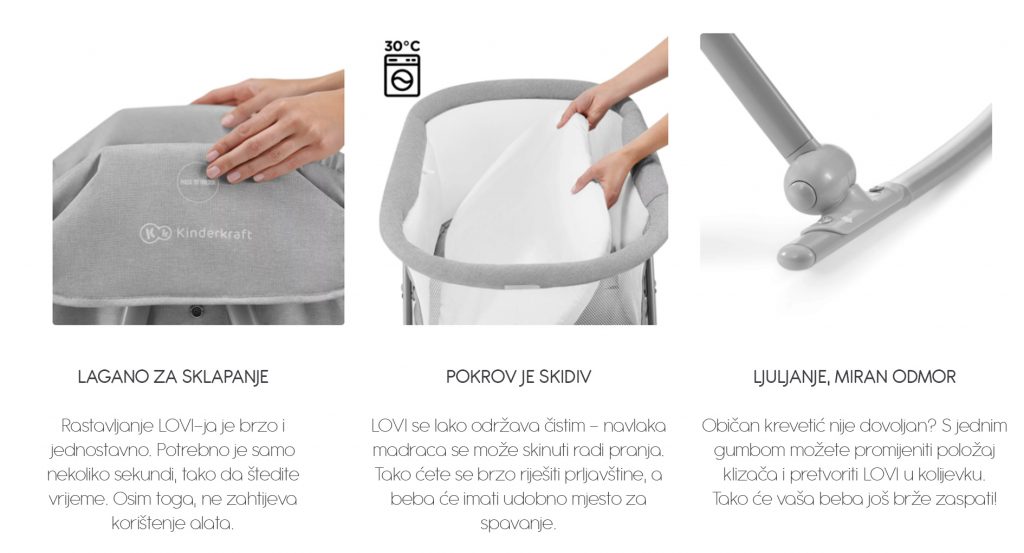 Kratki opis: Dječji krevetić LOVI 3 u 1 iznimno je funkcionalan. Može se koristiti kao kolijevka, putni krevet ili dječji krevet za dom.