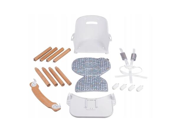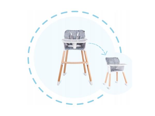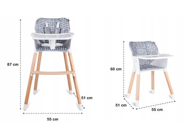 Posebna konstrukcija od trajnog bukovog drveta i ABS materijala omogućuju vam da dijete koristi nisku stolicu dok ne pređe 40Kg mase. Gornja visoka stolica pogodna je za djecu mase do 15 kg. Osim toga, stolica je opremljena prikladnom ručkom za lakše nošenje.