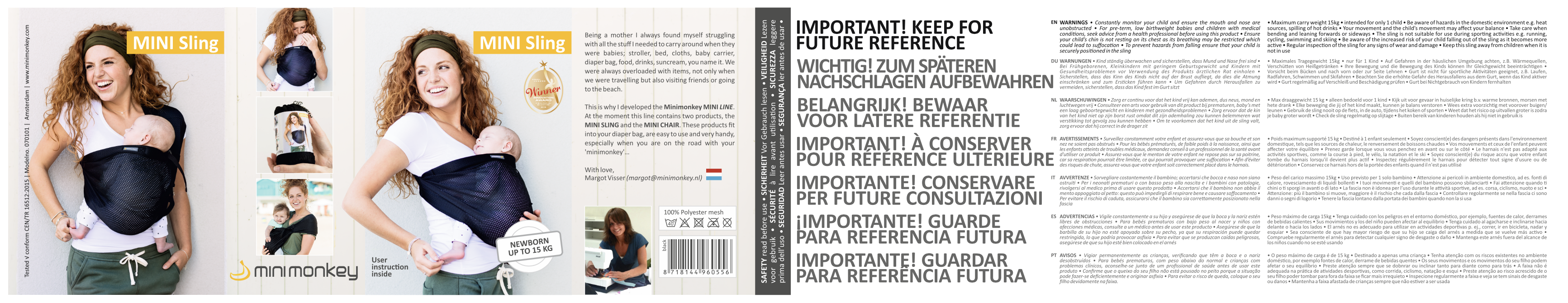 Prozračna Mini Sling nosiljka omogućuje ergonomsko nošenje bebe od rođenja do 2 godine ili max 15 kg. Sigurno: usklađeno sa svim sigurnosnim normama EU-a. Može se prati na 40º (u vrećici za pranje i pri niskim okretajima)