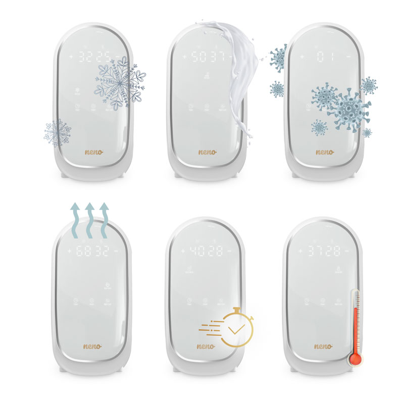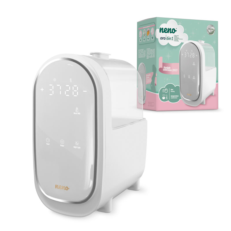 Zaboravite na velike i teške kućanske aparate. Neno Lindo je kompaktan, funkcionalan 6-u-1 uređaj, a u isto vrijeme moderan i minimalističan kuhinjski gadget. Njegova svestrana uporaba savršeno se uklapa u dinamičan stil života svake obitelji. Lindo podržava čak 6 načina rada koji uključuju npr. temeljita sterilizacija bočica, duda i sisača, te funkcija MILK s temperaturom od 40°C idealna za zagrijavanje mlijeka. Zaslon osjetljiv na dodir s pristupom svim programima i ugrađeno LED svjetlo omogućuju brzo i praktično korištenje 24 sata dnevno, ovisno o potrebama roditelja i mališana.