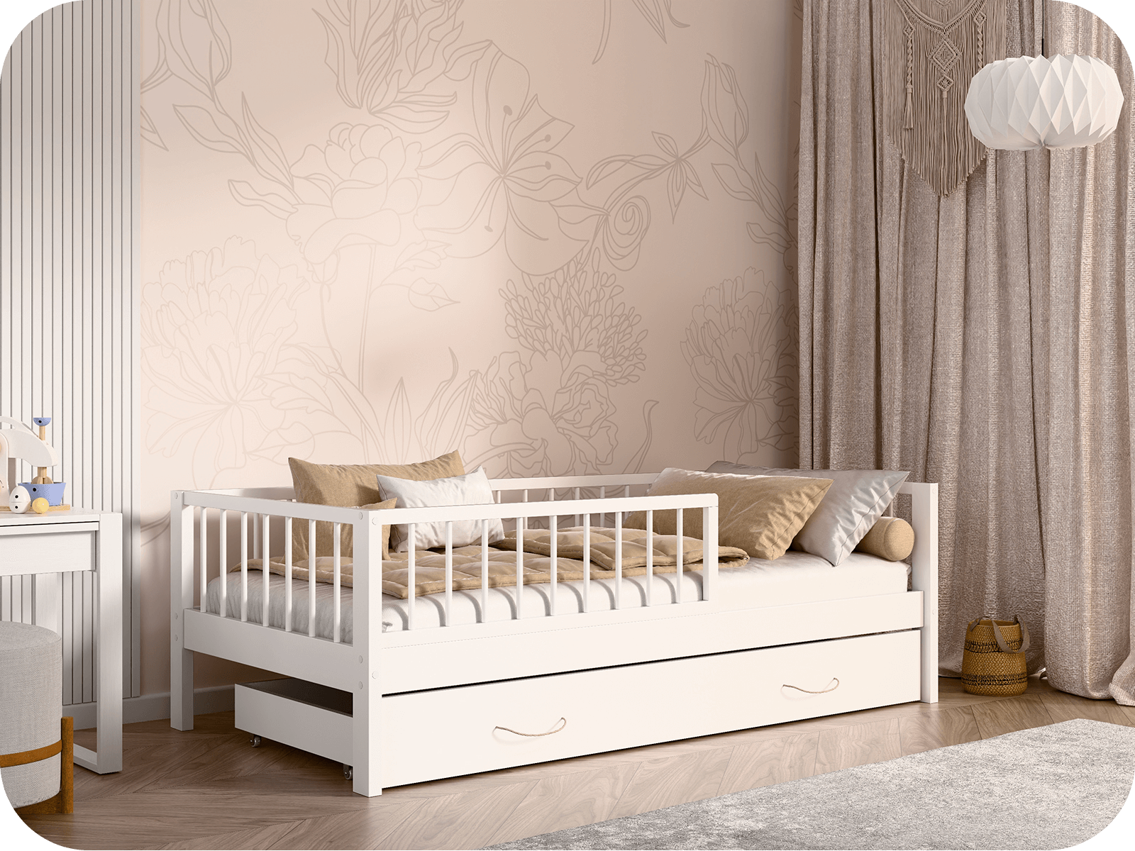 Ugradnja sigurnosne ograde s lijeve ili desne strane omogućuje vam prilagodbu dječjeg kreveta rasporedu sobe i zaštitu djeteta od slučajnih padova dok ne bude spremno samostalno zaspati. Osim toga, praktična ladica na kotačima omogućuje jednostavno spremanje posteljine, igračaka i odjeće, pomažući u održavanju urednosti sobe i uštedi prostora.