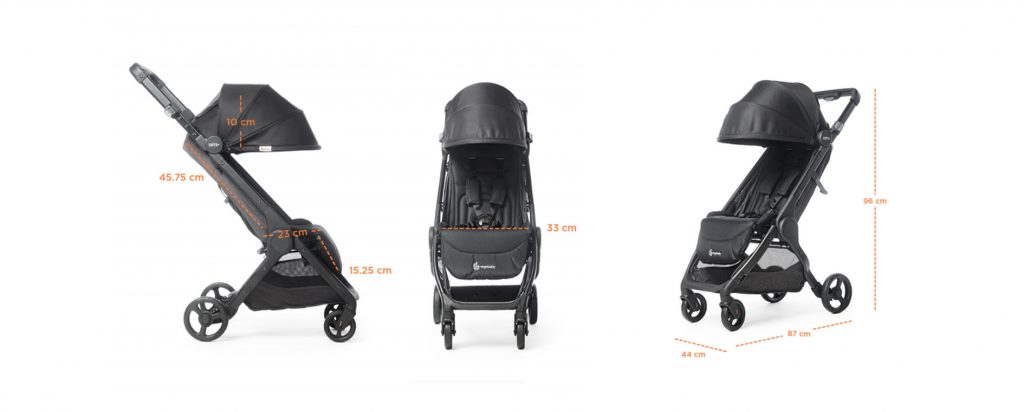 Dimenzije rasklopljenih Metro+ kolica: 96/105 cm visina × 44 cm širina × 87 cm dužina.