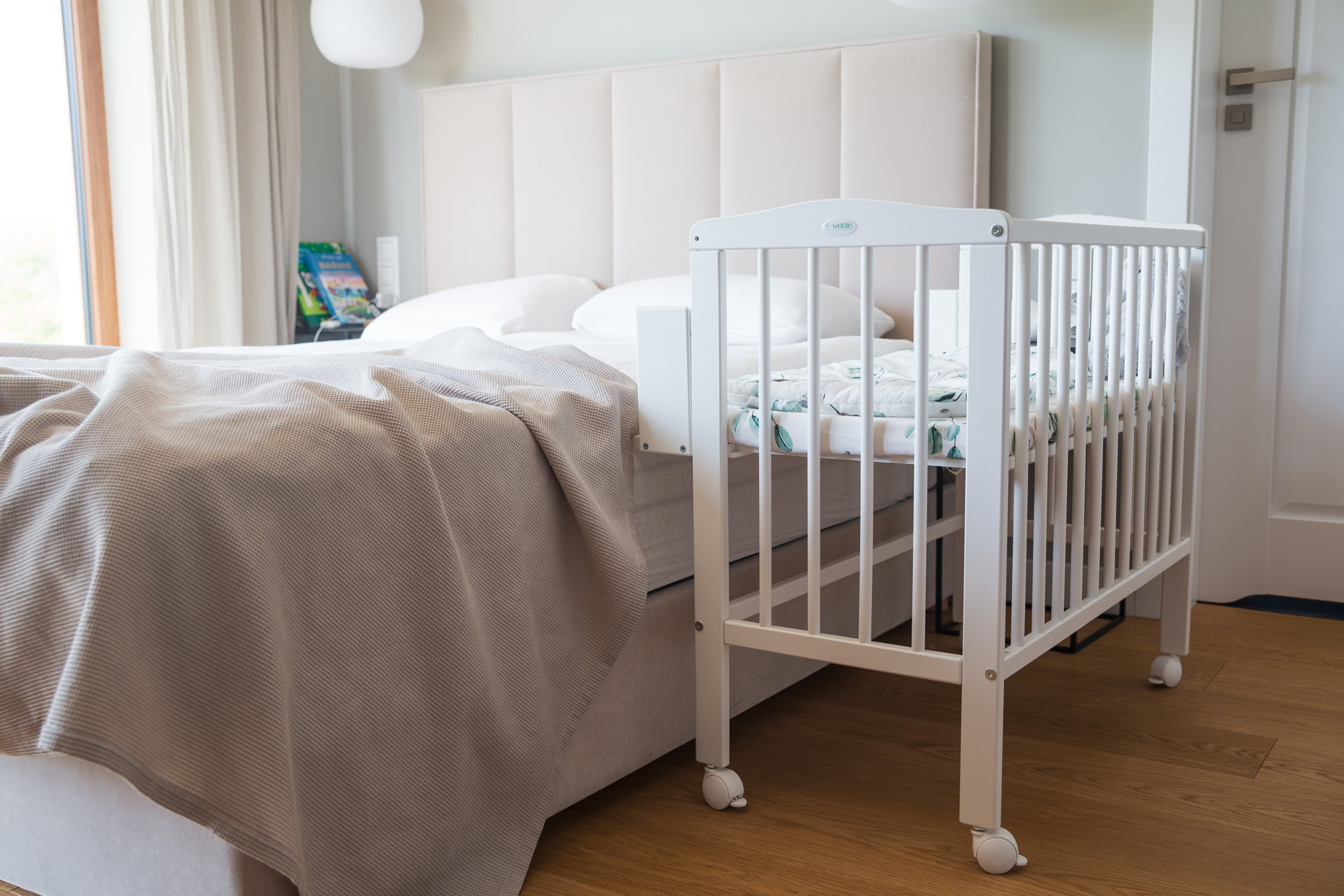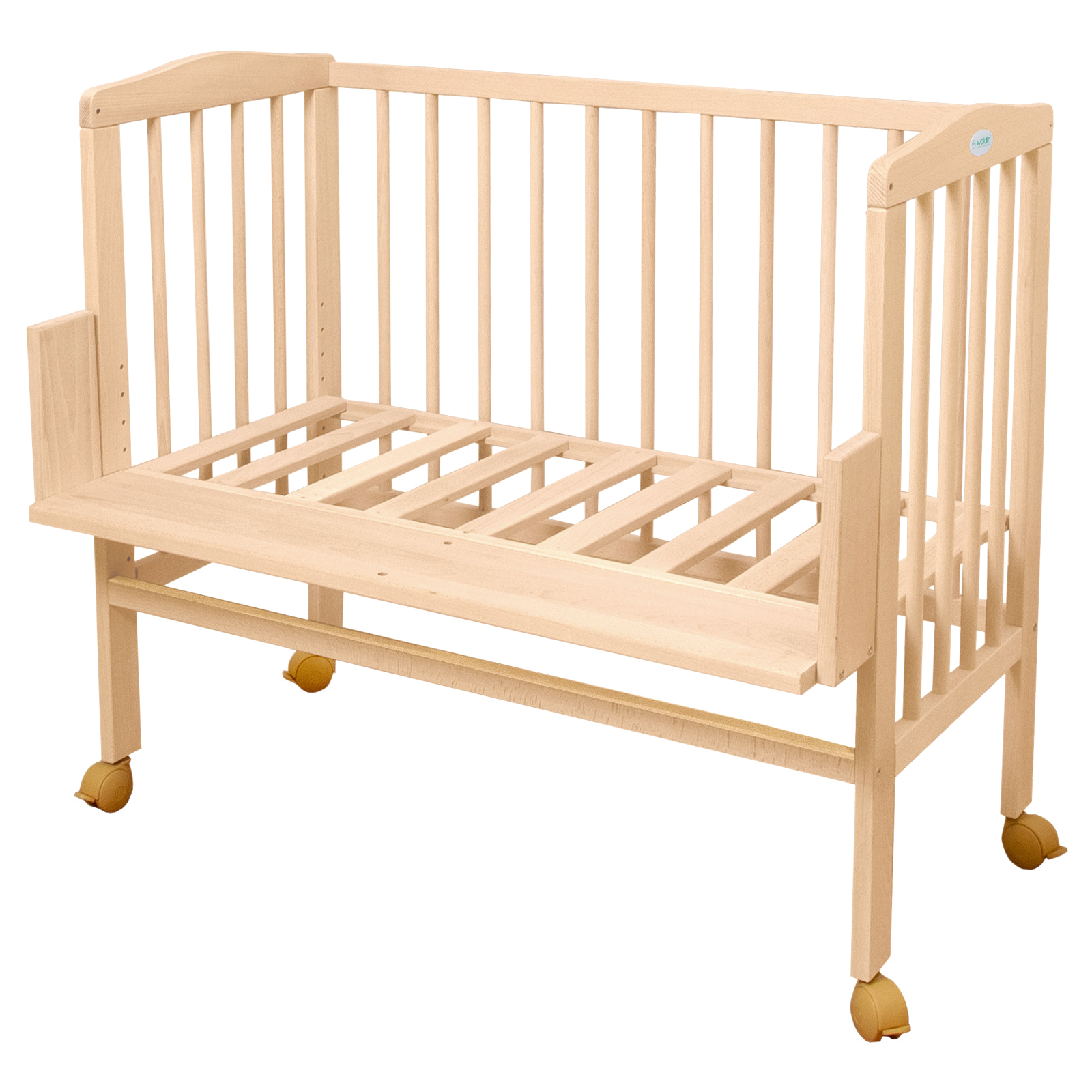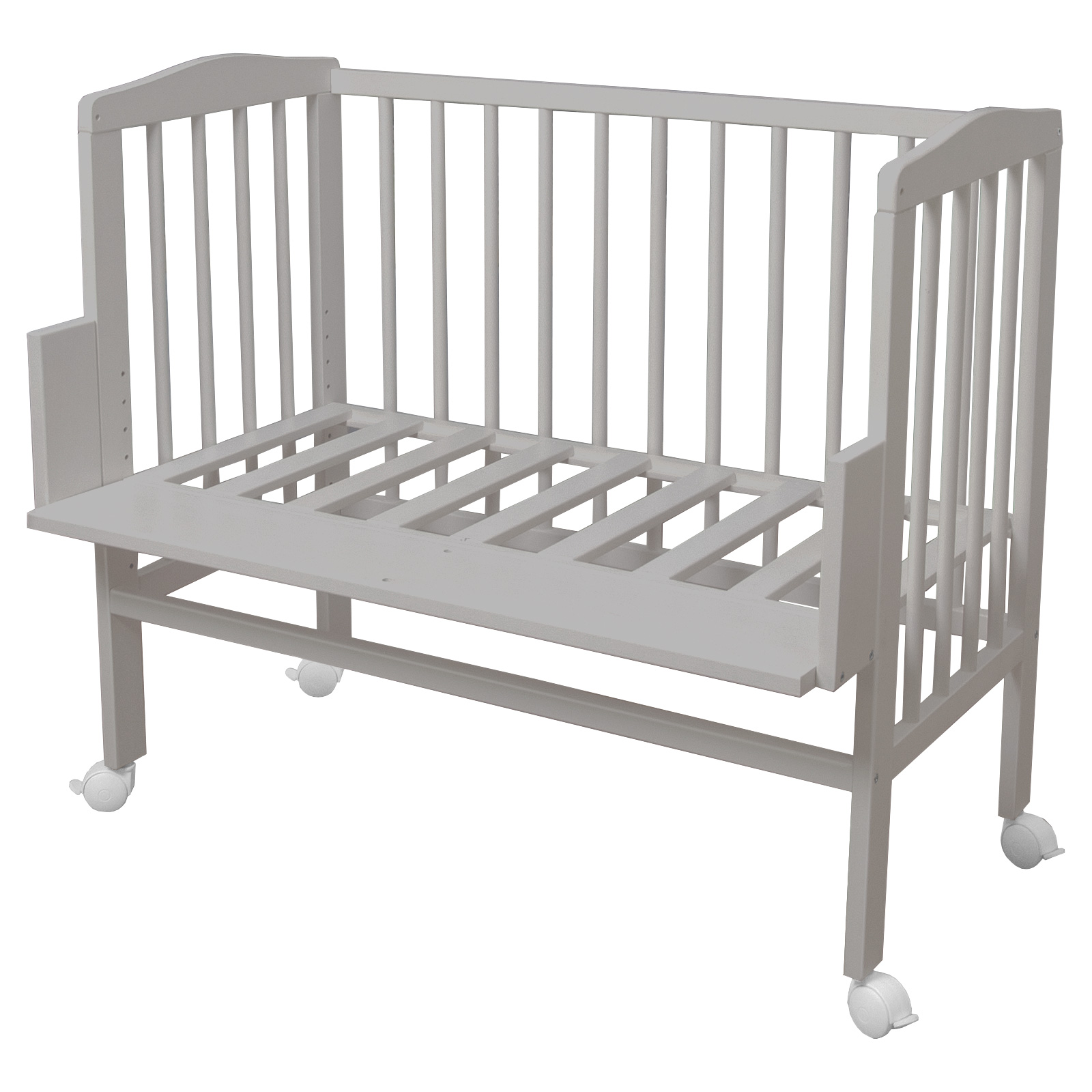 Ovaj bočni krevetić lako se pretvara u vrlo udoban i praktičan krevetić s četiri zatvorene stranice. Također dolazi s kotačićima koji omogućuju slobodno kretanje krevetića. Kotači se mogu zaključati kako bi se osigurala sigurnost i stabilnost kada je dijete unutra.