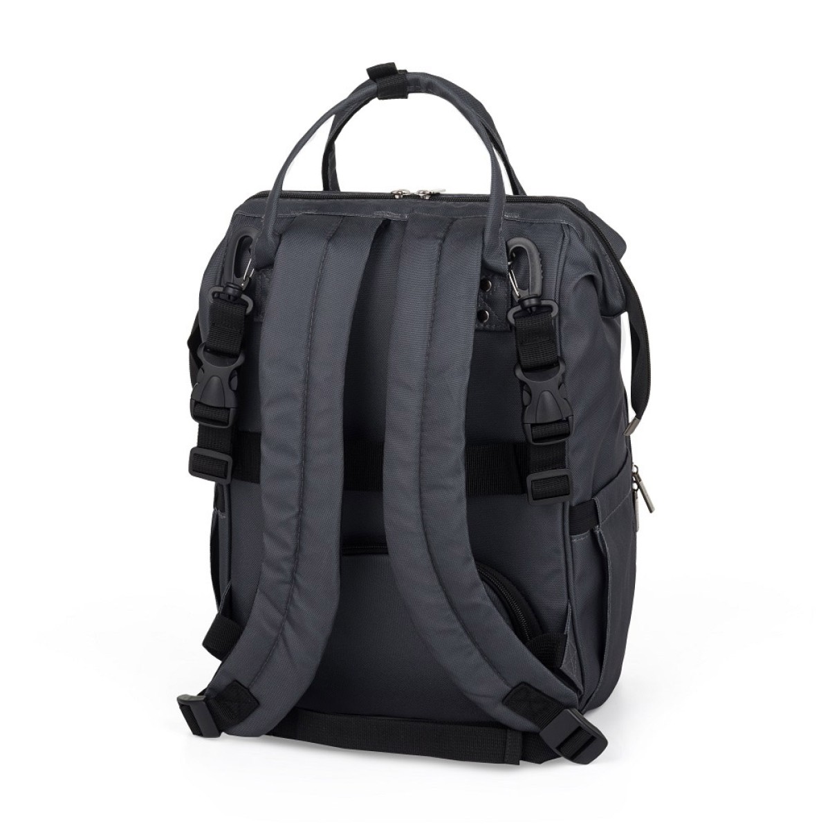 Ovaj udoban ruksak izrađen je od visokokvalitetnih, vodootpornih materijala. S bočnim trakama za pričvršćivanje na kolica i glavnim odjeljkom zatvorenim dvostrukim patentnim zatvaračem, lako ćete pronaći sve što vam treba. Brojni džepovi olakšat će pakiranje stvari za izlet ili šetnju. Ruksak ima termo pretinac, pretinac za vlažne predmete, džepove za boce i remen za ključeve. Uključena je i podloga za presvlačenje. Težina ruksaka bez sadržaja ne prelazi jedan kilogram.