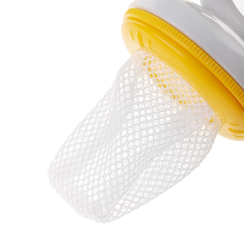 Sa svojim jednostavnim mrežastim dizajnom, ova praktična hranilica omogućuje bebama sigurno grickanje hrane. Jednostavno stavite komad voća u mrežastu vrećicu i zatvorite je. Beba može žvakati, sisati i kušati svu hranu, samo s malim, probavljivim komadićima - čime se smanjuje rizik od gušenja. Također je pametna alternativa igrački za zube. Hranilica ima ručku koja se lako drži.